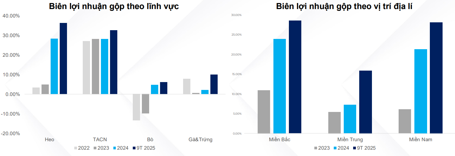 TACN là mảng có biên lãi gộp khá ổn định liên tục duy trì trên 30%, cao hơn rất nhiều mức 15-20% của DBC, riêng mảng heo biên lãi gộp của HPA cũng ở mức cao hơn so với các doanh nghiệp cùng ngành, đương nhiên vẫn sẽ bị biến động theo giá heo hơi trong nước. Về địa lí thì gần như không có quá nhiều khác biệt tại miền Nam và miền Bắc, chỉ riêng miền Trung biên lãi gộp khá thấp, tuy nhiên tỷ trọng tại miền Trung là không lớn.