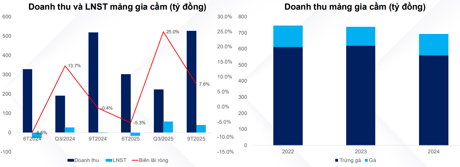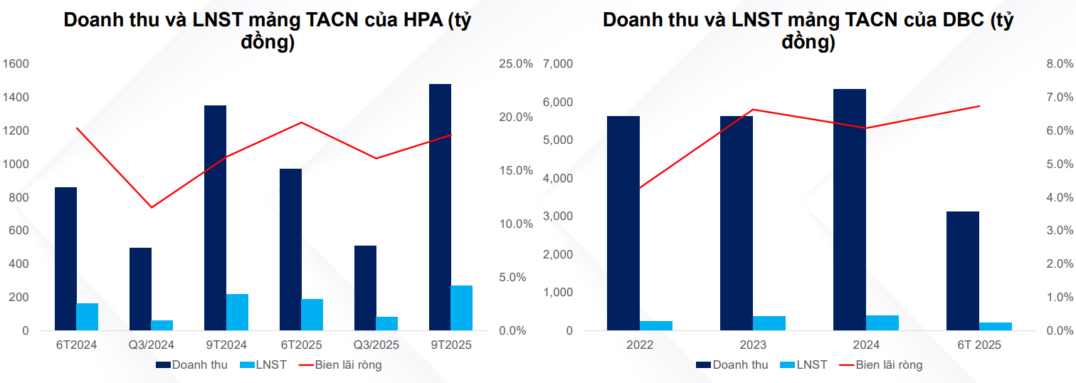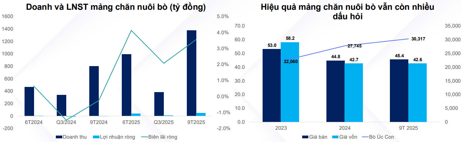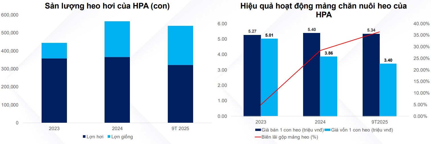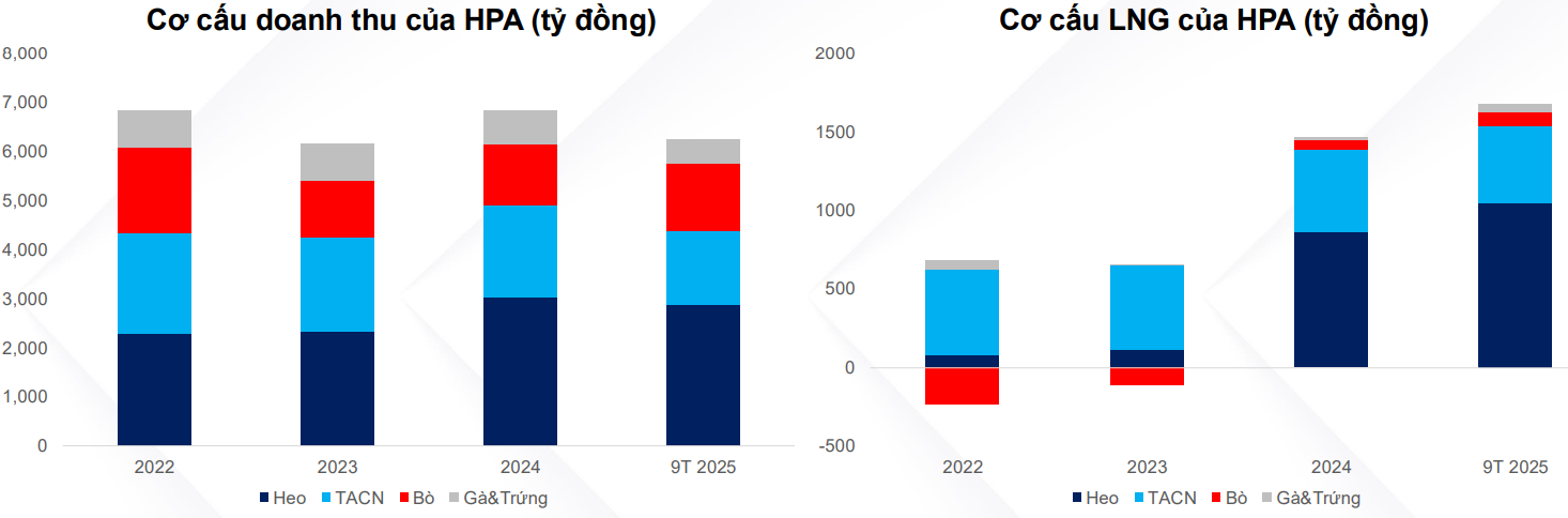 Sau giai đoạn khó khăn 2022-2023, mảng chăn nuôi bò của HPA đối mặt với thua lỗ khi có mức biên lãi gộp lần lượt -13.3% và 9.8% do HPA tái cơ cấu lại mảng này và tình trạng nạp lực phục vụ, tuy nhiên tới 9T2025 thì mảng này đã bắt đầu có lãi trở lại, đạt 4% biên lãi ròng. Giai đoạn 2017-2021 mảng chăn nuôi bò Úc từng đóng góp lợi nhuận lớn nhất cho HPA, trong thời gian tới nhờ chính sách từ Chính phủ, HPA kì vọng mảng này sẽ phục hồi lại tốt hơn.
