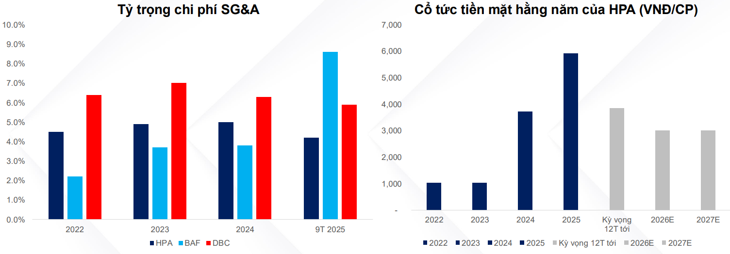 Tỷ trọng chi phí SG&A/doanh thu của HPA duy trì thấp nhất ngành chỉ quanh mức dưới 5% và cổ tức trả đều đặn trong suốt 4 năm qua