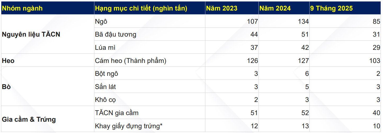 Đối với TĂCN, các nguyên liệu đầu vào chính bao gồm ngô (58% tổng khối lượng đầu vào), đậu tương (28%), và lúa mì (19%), dựa trên dữ liệu trung bình giai đoạn 2023–2024. Đối với chăn nuôi heo, đầu vào bao gồm heo giống (được HPA tự cung cấp 100% thông qua quy trình chăn nuôi khép kín của công ty) và TĂCN cho heo, cũng được cung cấp 100% từ các nhà máy TĂCN của HPA. Đối với chăn nuôi bò, HPA nhập khẩu bò tơ miễn nhiễm từ Úc và nuôi chúng đạt tới trọng lượng thương phẩm để bán, với chế độ ăn chủ yếu là bột ngô, sắn và bã cọ. Đối với chăn nuôi gia cầm và sản xuất trứng, đầu vào chính là gà mái đẻ giống và TĂCN cho gia cầm – được tự cung cấp 100%