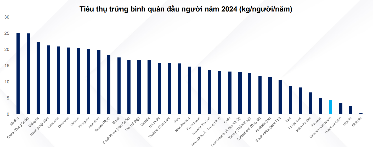 Mức tiêu thụ trứng bình quân đầu người tại Việt Nam vẫn thấp so với tiêu chuẩn khu vực. Theo dữ liệu của OECD, mức tiêu thụ bình quân đầu người là 4,2 kg/người (tương đương khoảng 202 trứng) vào năm 2024, so với 25,0 kg ở Trung Quốc, 22,2 kg ở Malaysia và 21,3 kg ở Nhật Bản, cùng nhiều quốc gia khác. Hiệp hội Chăn nuôi gia cầm Việt Nam kỳ vọng mức tiêu thụ sẽ đạt 250 trứng/người vào năm 2030, tương ứng tốc độ tăng trưởng bình quân đầu người là CAGR 3,6%. Kết hợp với dự báo tăng trưởng dân số của UNDESA là CAGR 0,5%, chúng tôi dự phóng tổng nhu cầu về trứng sẽ tăng 4,1–4,2% mỗi năm cho đến năm 2030.
