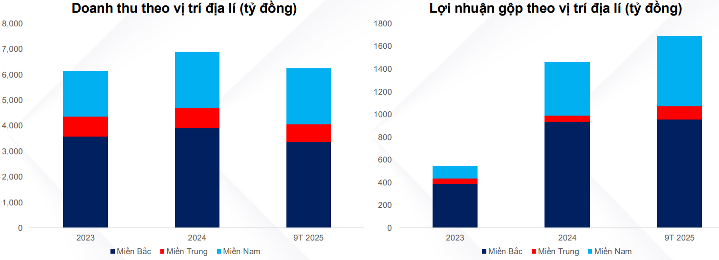 Về mặt địa lý, miền Bắc là thị trường lớn nhất của HPA, đóng góp hơn 50% cả doanh thu và lợi nhuận gộp, tiếp theo là miền Nam với hơn 30%, dựa trên dữ liệu 2023–9T 2025.