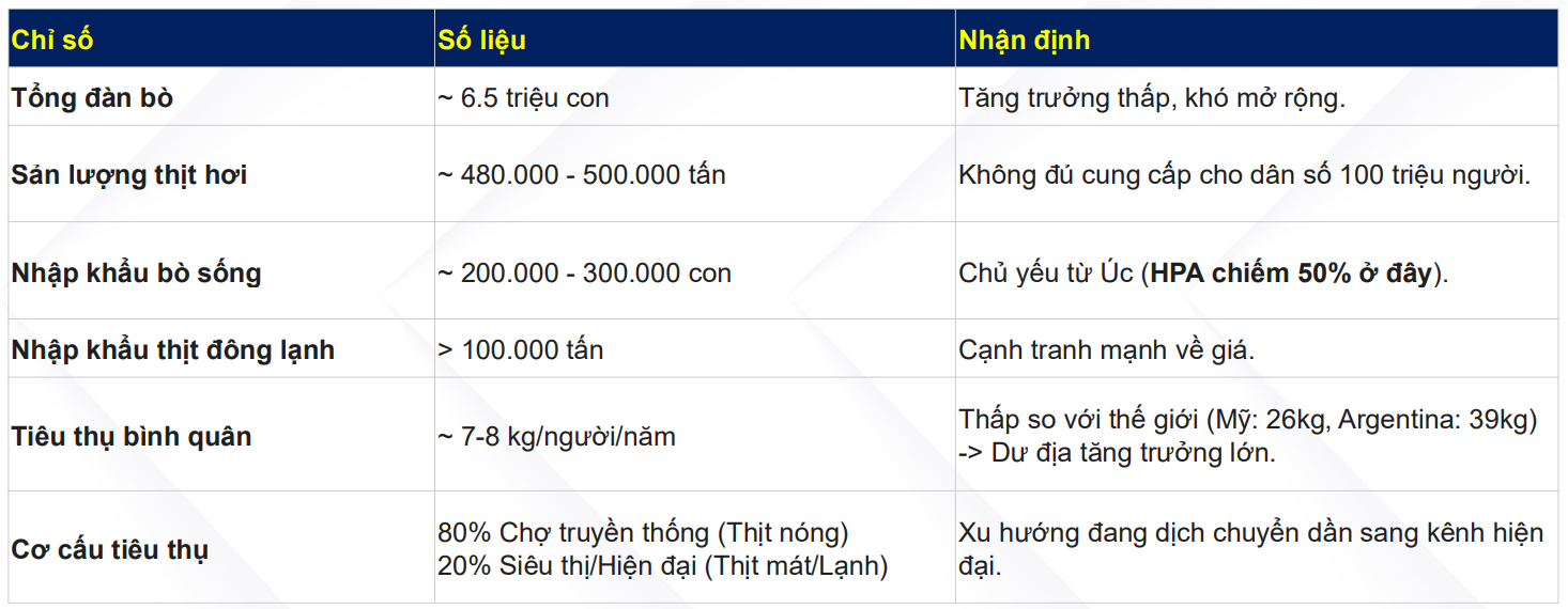 Hiện HPA chiếm 50% thị phần nhập khẩu bò Úc, ngành này có biên lãi không quá hấp dẫn và có các rào cản gia nhập cao do tính chất yêu cầu cao về vốn, quy định, và các yêu cầu vận hành khắt khe. Quy trình ESCAS của Chính phủ Úc càng làm tăng các rào cản gia nhập bằng cách áp đặt các tiêu chuẩn nghiêm ngặt về phúc lợi động vật và khả năng truy xuất nguồn gốc chuỗi cung ứng, hạn chế sự tham gia của các nhà sản xuất nhỏ hơn hoặc thiếu vốn. Cuối cùng, việc đạt được khả năng cạnh tranh trong lĩnh vực này phụ thuộc vào lợi thế kinh tế theo quy mô, vì các hoạt động quy mô lớn có vị thế tốt hơn để giảm chi phí trên mỗi đơn vị trong mua sắm, thức ăn và logistics, qua đó nâng cao hiệu quả vận hành và duy trì vị thế dẫn đầu thị trường.