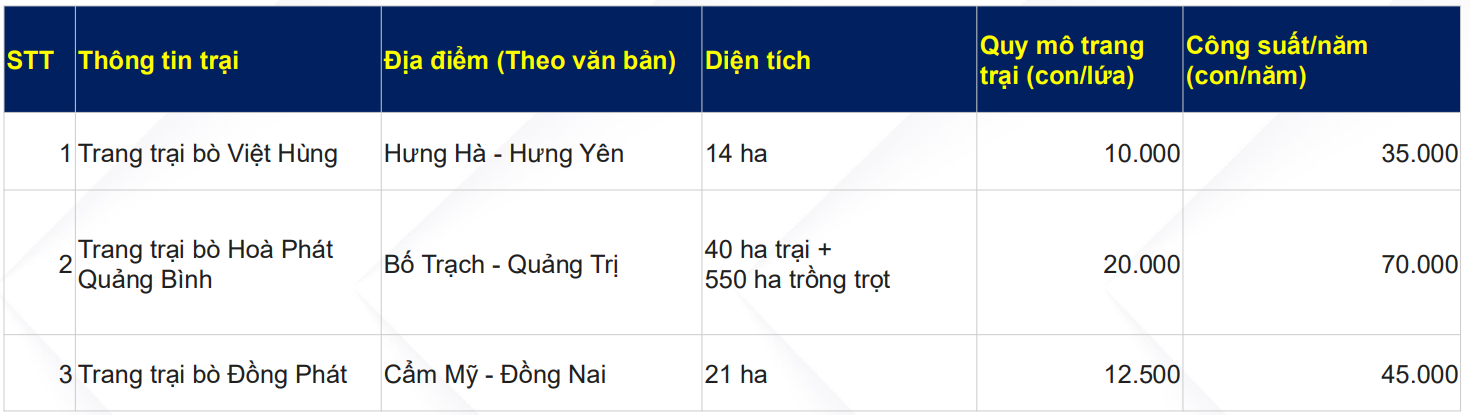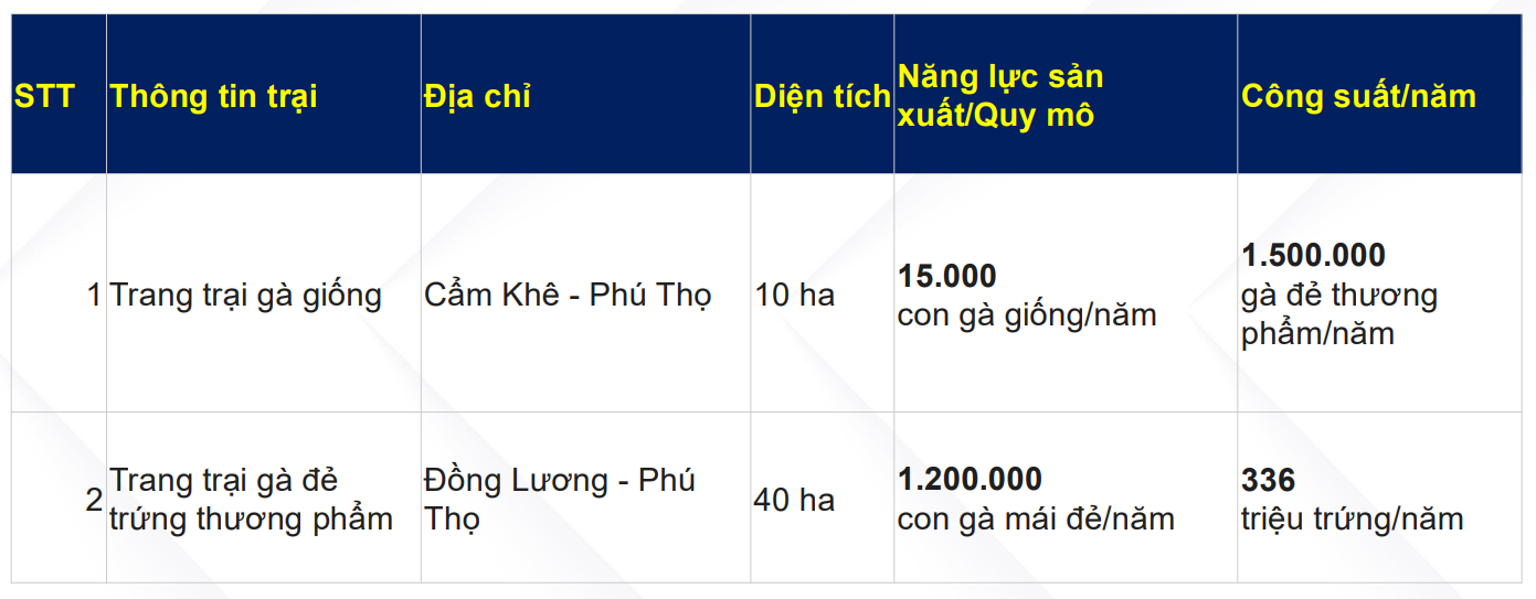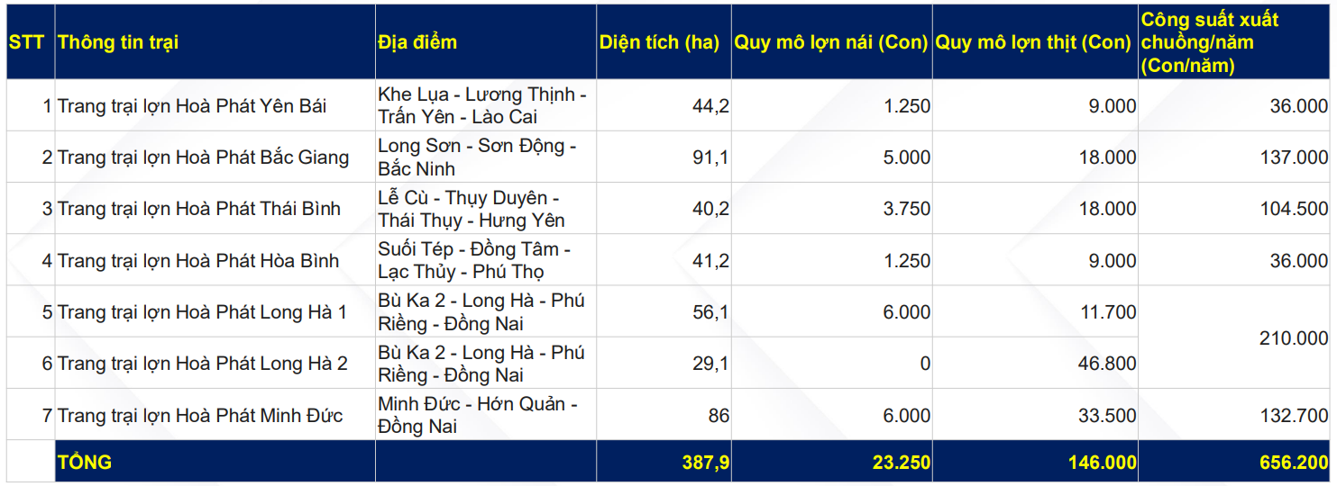 HPA vận hành 6 trang trại chăn nuôi heo, 4 ở miền Bắc và 2 ở miền Nam. Tất cả các trang trại có tổng công suất thiết kế hàng năm (số lượng heo thịt thương phẩm tối đa nuôi được trong một năm) là 656.200 con/năm, được phân bổ tương đối đồng đều giữa miền Bắc (khoảng 313.500 con) và miền Nam (khoảng 342.700 con). Nếu tính cả heo con thương phẩm (tức là heo con được sinh ra bởi heo bố mẹ, tuổi từ sơ sinh đến vài tuần tuổi), tổng công suất thiết kế hàng năm sẽ là 750.000 con/năm