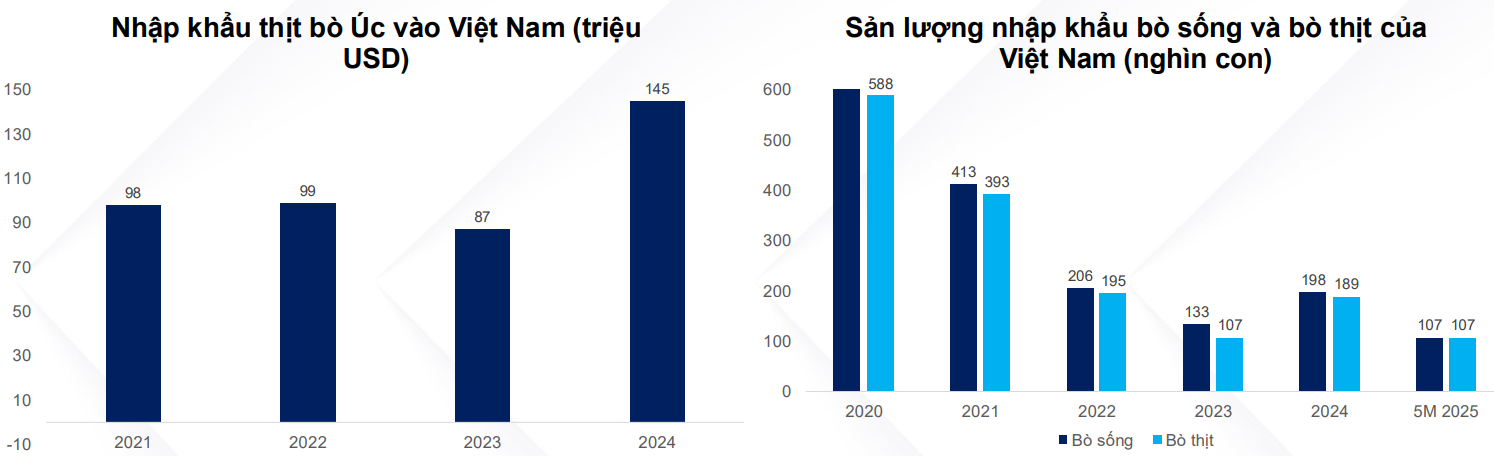 Theo OECD, lượng tiêu thụ thịt bò bình quân đầu người của Việt Nam đạt 6,5 kg/người vào năm 2024. Mức này cao hơn nhiều nước Đông Nam Á khác như Thái Lan (1,9 kg), Indonesia (2,8 kg) và Philippines (3,3 kg), nhưng vẫn thấp hơn các nền kinh tế phát triển hơn như Trung Quốc (7,8 kg), Nhật Bản (10,6 kg) và Hàn Quốc (18,6 kg). Khoảng cách này cho thấy tiềm năng tăng trưởng đáng kể đối với bò Việt Nam. OECD dự phóng Việt Nam sẽ ghi nhận tốc độ tăng trưởng tiêu thụ thịt bò nhanh nhất thế giới với CAGR 4,1% trong giai đoạn 2024–2033, được hỗ trợ bởi thu nhập tăng và tầng lớp trung lưu mở rộng sẵn sàng chi trả cho các nguồn protein giá trị cao hơn.