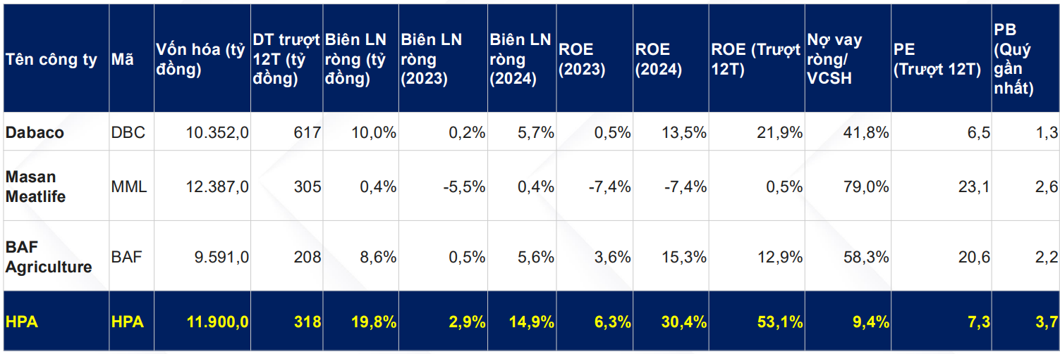 Hiệu quả sinh lời của HPA vượt trội so với các doanh nghiệp niêm yết tại như BAF, DBC, gần như biên lãi ròng và ROE cao hơn gấp đôi và bỏ xa khá nhiều so với đối thủ, trái ngược với sự phụ thuộc vào biến động giá heo và TACN hàng năm thì HPA kể từ khi thành lập tới nay hơn 10 năm vẫn chưa có năm nào lỗ, đây là điều rất tích cực, cho thấy sự ổn định và hiệu quả của doanh nghiệp đã được chứng minh qua vài chu kỳ dài