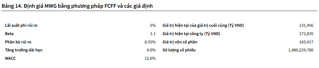 (1) Phương pháp chiết khấu dòng tiền: Chúng tôi sử dụng phương pháp chiết khấu dòng tiền tự do vốn sở hữu FCFF với các giả định nêu dưới đây. Chúng tôi đưa ra mục tiêu cổ phiếu MWG đối với phương pháp này là 111,800 VND/cổ phiếu.