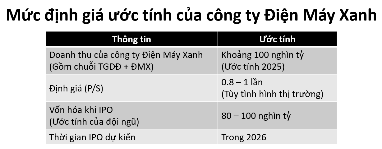 Mặc dù chưa công bố mức giá IPO cụ thể, nhưng đội ngũ ước tính công ty Điện Máy Xanh sẽ được định giá khoảng 80 – 100 nghìn tỷ, tương đương P/S = 0.8 – 1 lần. Đội ngũ sẽ tiếp tục cập nhật đến NĐT khi có thông tin cụ thể về thương vụ IPO này.