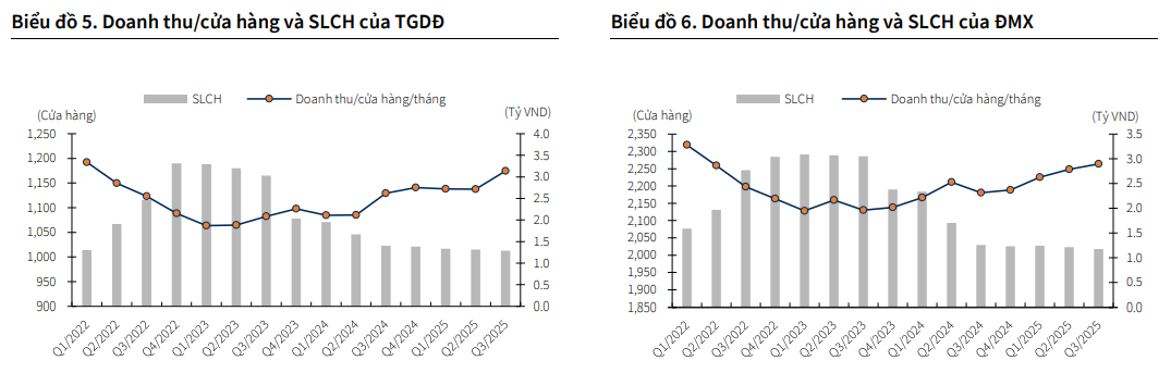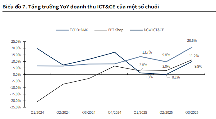 Chuỗi TGDD+DMX tiếp tục nối dài chuỗi tăng trưởng ấn tượng trong bối cảnh số lượng cửa hàng vật lý tiếp tục thu hẹp so với đầu năm. Kết thúc quý 3/2025, SSSG đánh dấu mức cao nhất kể từ quý 3/2022, đồng thời đều đạt mức cải thiện trên 15% YoY và QoQ. Thành quả trên đến từ việc bùng nổ doanh số mặt hàng điện thoại (ra mắt Iphone 17) và laptop, giúp TGDD+DMX có tháng tăng trưởng thứ 7 liên tiếp.