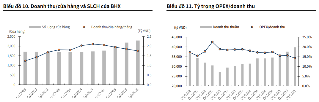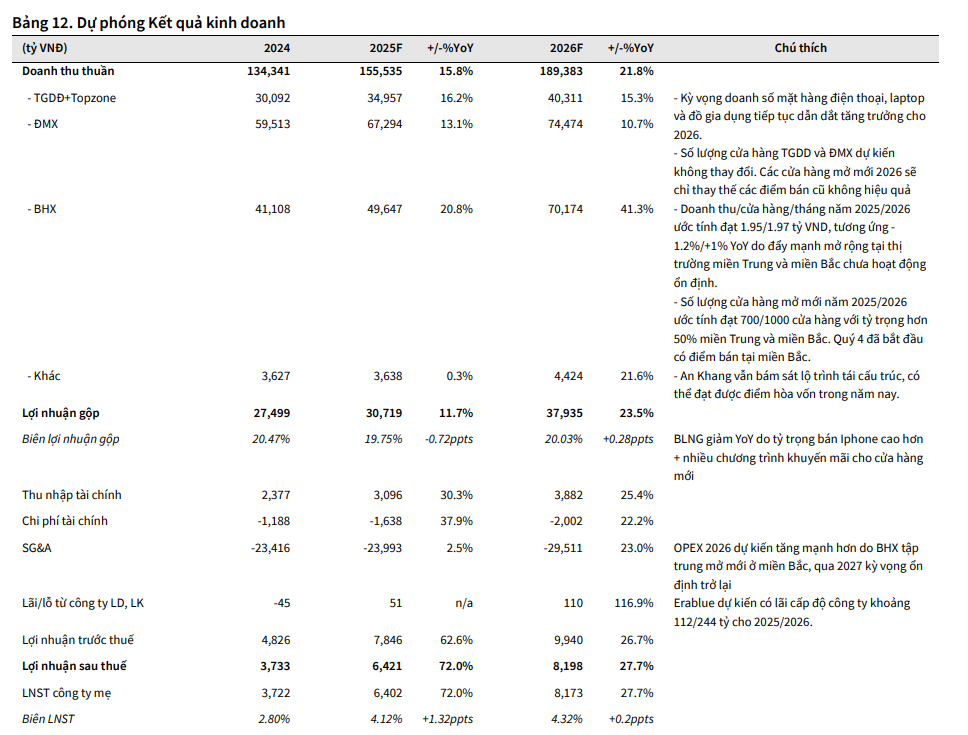 • Tối ưu hóa chi phí vận hành (OPEX): Tỷ trọng chi phí trên doanh thu dự kiến giảm dần nhờ lợi thế quy mô và đòn bẩy hoạt động. Tốc độ tăng trưởng doanh thu – được thúc đẩy bởi việc mở rộng thị trường của BHX và vị thế thống lĩnh của TGDD/ĐMX sẽ vượt qua tốc độ tăng chi phí.