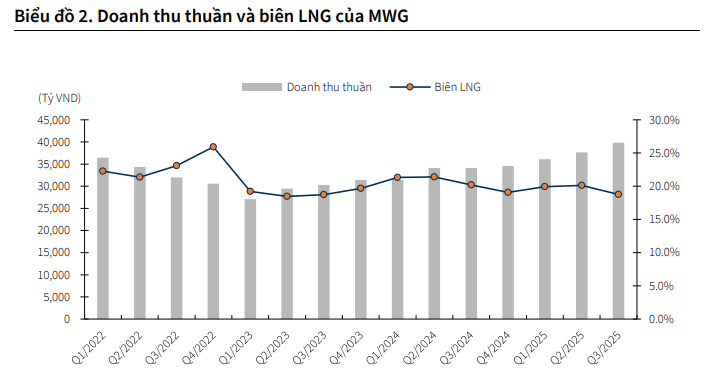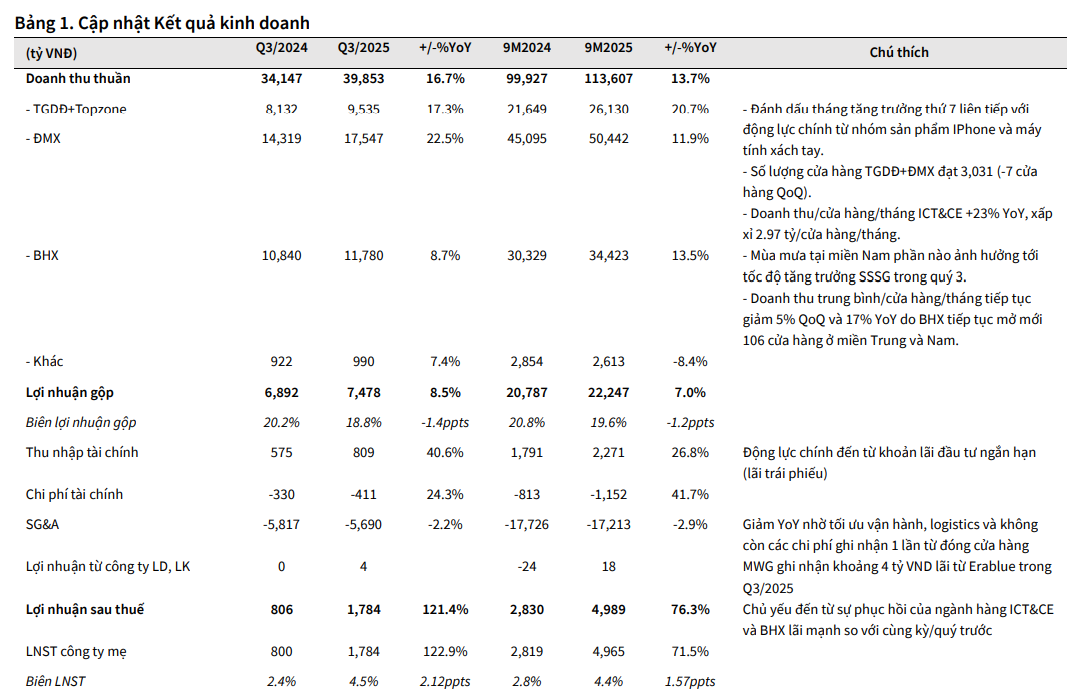 Kết thúc 9M2025, MWG ghi nhận doanh thu thuần đạt 113,607 tỷ VND (+13.7% YoY). Mảng ICT&CE duy trì chuỗi tăng trưởng 2 chữ số trong 9T2025. Chuỗi BHX ước tính lãi khoảng 240 tỷ trong quý 3/2025. Lũy kế 9M2025, biên LNST tiếp tục duy trì trên mức 4%, LNST đạt 4,965 tỷ (+72% YoY), vượt kế hoạch cả năm.