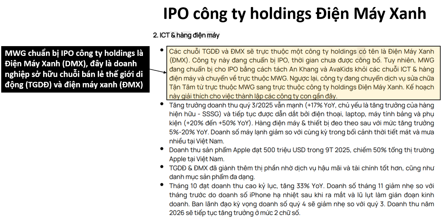 Tại cuộc họp nhà đầu tư vào ngày 26/11/2025, MWG công bố thông tin chuẩn bị IPO công ty holdings là Điện Máy Xanh (DMX), đây là doanh nghiệp sở hữu chuỗi bán lẻ thế giới di động (TGDĐ) và điện máy xanh (ĐMX). Hiện nay, thế giới di động (TGDĐ) và điện máy xanh (ĐMX) đang là 2 chuỗi bán lẻ đóng góp trên 90% lợi nhuận của MWG.