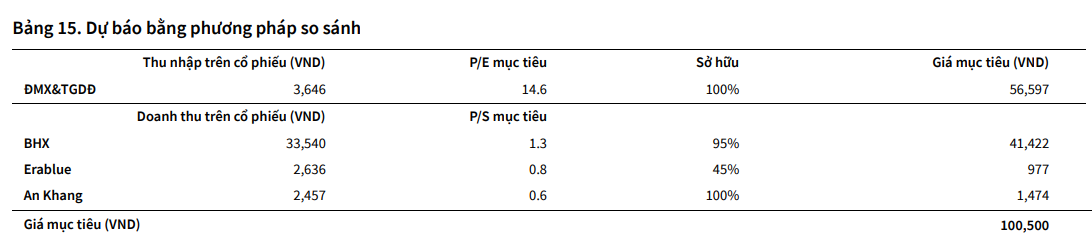 (2) Phương pháp so sánh: Chúng tôi sử dụng P/E và P/S cho từng chuỗi khác nhau, chúng tôi sử dụng mức P/E hợp lý đạt 14.6x cho chuỗi TGDĐ và DMX. Đối với BHX, chúng tôi sử dụng P/S mục tiêu là 1.3 được tính toán dựa trên giao dịch mua lại 5% BHX của CDH investments. Chuỗi An Khang hiện chưa có lãi vậy nên chúng tôi sử dụng mức P/S = 0.6 là mức hợp lý của các cửa hàng bán lẻ dược phẩm ở Đông Nam Á. Chuỗi EraBlue với tiềm năng tăng trưởng dài hạn trên đất Indonesia, vậy nên chúng tôi cho rằng mức P/S hợp lý cho chuỗi này đạt 0.8 lần. Chúng tôi đưa ra giá mục tiêu cho cổ phiếu MWG đối với phương pháp này là 100,500 VND/cổ phiếu.