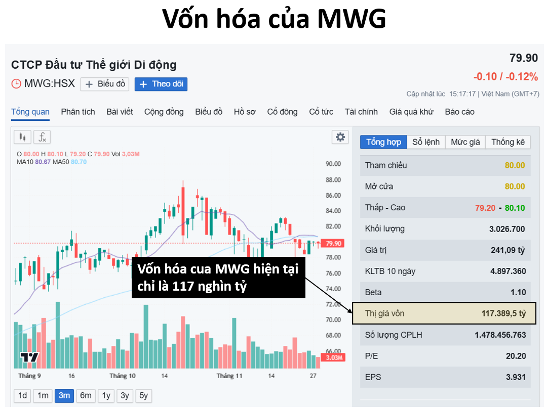 Vốn hóa hiện tại của MWG là 117 nghìn tỷ, không cao hơn quá nhiều so với mức giá IPO dự kiến của công ty Điện Máy Xanh là 100 nghìn tỷ. Do đó, khi Điện Máy Xanh IPO vào 2026 sẽ là động lực giúp cho cổ phiếu MWG tăng.