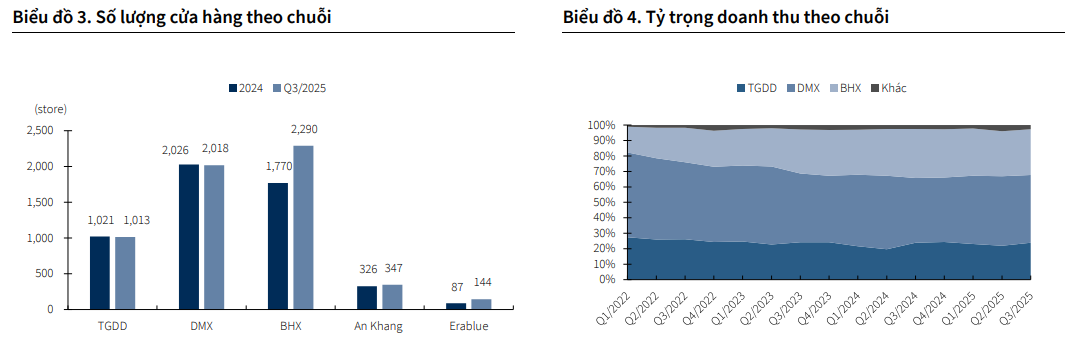 • EraBlue tăng trưởng doanh thu +70% YoY sau 10 tháng 2025, hiện chuỗi đã mở mới vượt mục tiêu đầu năm là 150 cửa hàng và đang hướng tới con số 180 vào cuối năm, 330 cửa hàng vào 2026. Chuỗi có hiệu quả hoạt động tốt hơn so với ngành nhờ áp dụng mô hình TGDĐ+ĐMX và sự am hiểu tiêu dùng đối với người bản địa.